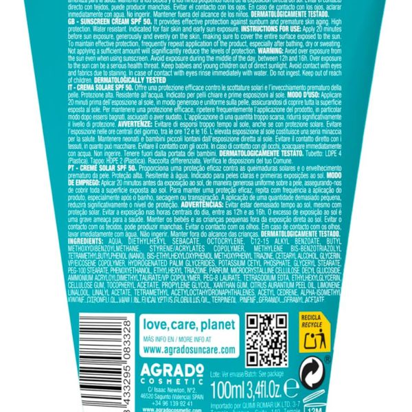 Agrado Crema Solar Cara Y Cuerpo Water Resistent 50Spf 100Ml
