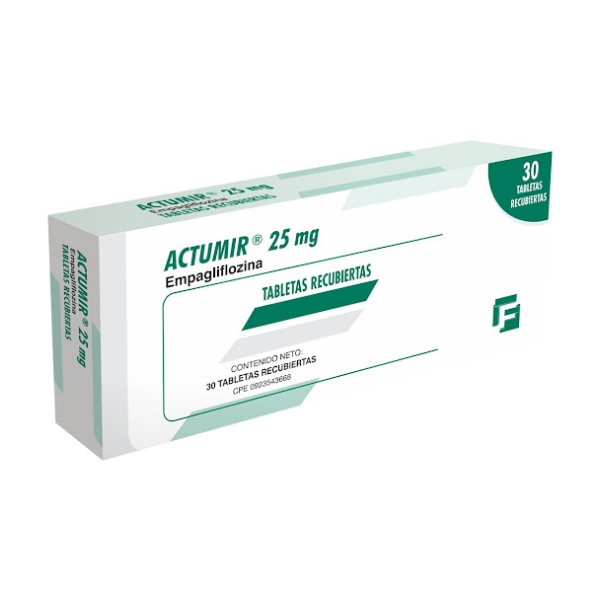 Actumir es un medicamento que contiene empagliflozina en una concentración de 25 mg por tableta. Se utiliza para el tratamiento de la diabetes tipo 2, ayudando a controlar los niveles de azúcar en la sangre al promover la eliminación de glucosa a través de la orina.