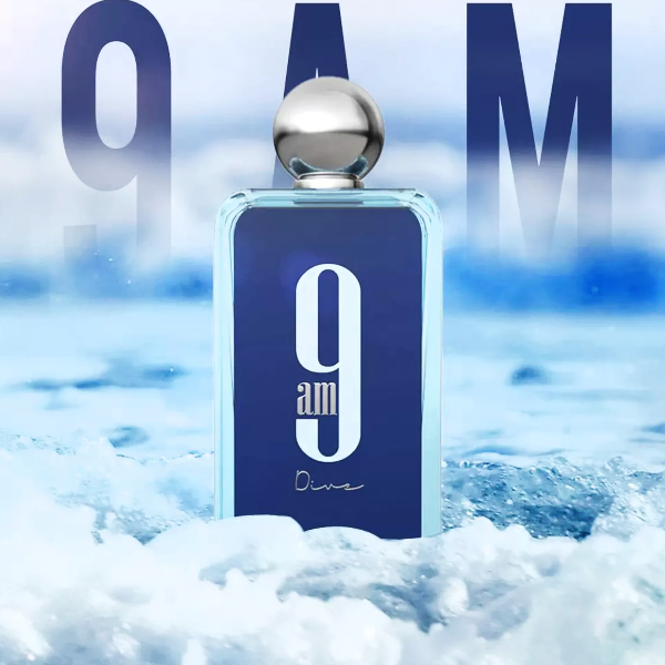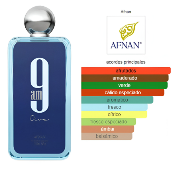 9am Dive de Afnan es una fragancia de la familia olfativa Aromática Acuática para Hombres y Mujeres. Esta fragrancia es nueva. 9am Dive se lanzó en 2022. Las Notas de Salida son limón (lima ácida), menta, grosellas negras y pimienta rosa; las Notas de Corazón son manzana, incienso y cedro; las Notas de Fondo son jengibre, sándalo, pachulí y jazmín.