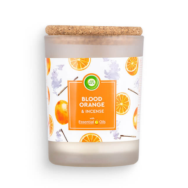 Vela aromática de Air Wick con aceites esenciales de naranja sanguina e incienso, diseñada para aportar una fragancia intensa y relajante.