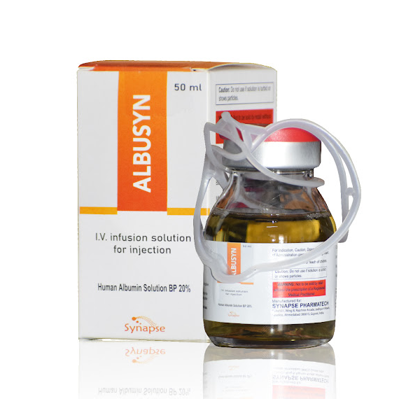 Ampolla de Albúmina Humana 20% Albusyn, presentación de 50 ml/200 g, utilizada bajo supervisión médica para tratar hipovolemia, quemaduras severas o hipoalbuminemia grave.