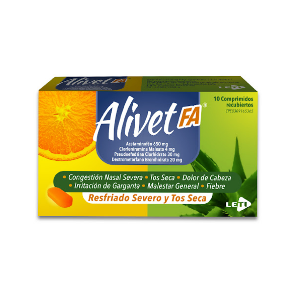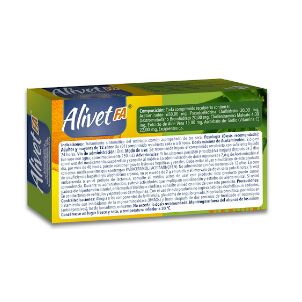 Alivet Fa contiene una combinación de Acetaminofén, Clorfeniramina, Pseudoefedrina y Dextrometorfano. Este medicamento está formulado para aliviar los síntomas del resfriado común y la gripe, incluyendo fiebre, dolores de cabeza, congestión nasal, estornudos y tos. El Acetaminofén actúa como analgésico y antipirético, la Clorfeniramina como antihistamínico para reducir la congestión y los estornudos, la Pseudoefedrina como descongestionante nasal y el Dextrometorfano como antitusivo para suprimir la tos.