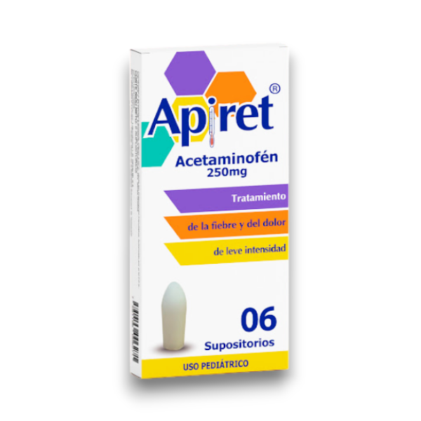Apiret se presenta en un envase que contiene 6 supositorios de 250 mg cada uno, diseñados para facilitar la administración y asegurar una dosificación adecuada para el manejo del dolor y la fiebre en niños.