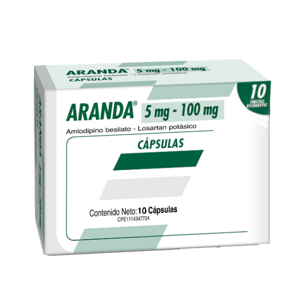 Aranda es un medicamento que combina amlodipina y losartán, utilizado en el tratamiento de la hipertensión arterial, ayudando a controlar la presión sanguínea y reducir el riesgo de complicaciones cardiovasculares.