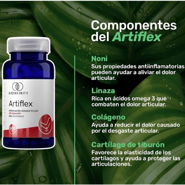 Artiflex es un suplemento natural formulado para mejorar la salud articular y aliviar el dolor muscular. Cada cápsula contiene 500 mg de ingredientes naturales que reducen la inflamación y mejoran la movilidad. Ideal para personas con artritis o lesiones deportivas, contribuye a la regeneración del cartílago y al mantenimiento de articulaciones saludables.