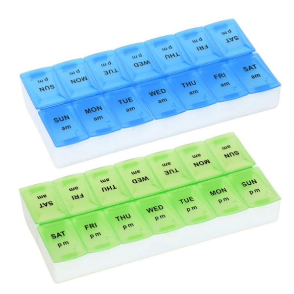 Pastillero semanal con compartimientos separados para cada día, ideal para mantener organizada la administración de medicamentos. Diseño compacto y resistente, fácil de transportar.