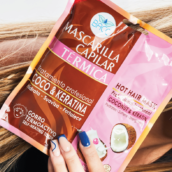 Mascarilla capilar con gorro térmico de coco y keratina de Bacc en envase de 25 ml de mascarilla y 23 ml de gorro, para reparar y nutrir el cabello en profundidad.