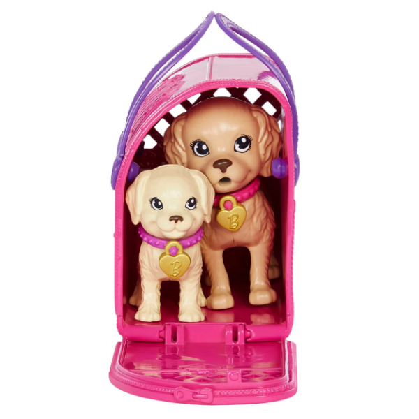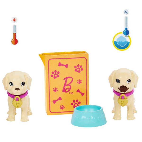 La muñeca Barbie adopta cachorros con el set de juego Pup Adoption. Las piezas que cuentan historias permiten a las jóvenes amantes de los animales convertirse en nuevas dueñas de perros y cuidar, alimentar y entrenar a dos adorables cachorros. La transformación con cambio de color agrega diversión al juego de roles durante la alimentación y el baño, y un transportador de mascotas que funciona amplía el juego de cuidados. La muñeca no puede mantenerse en pie sola. Los colores y las decoraciones pueden variar.