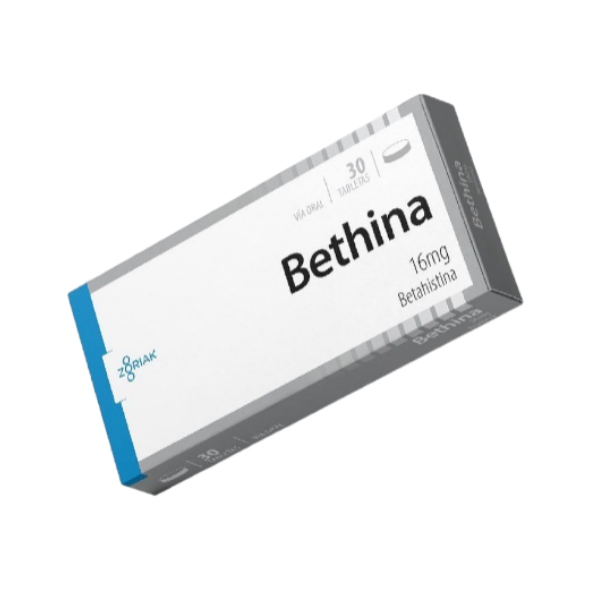 Bethina Betahistina 16 mg de Zoriak, 30 tabletas. Medicamento utilizado para el tratamiento de los síntomas del vértigo y la enfermedad de Ménière, mejorando el flujo sanguíneo en el oído interno y reduciendo la presión en esta área.