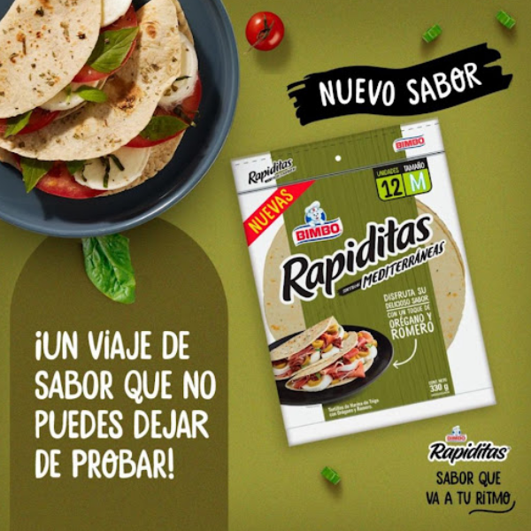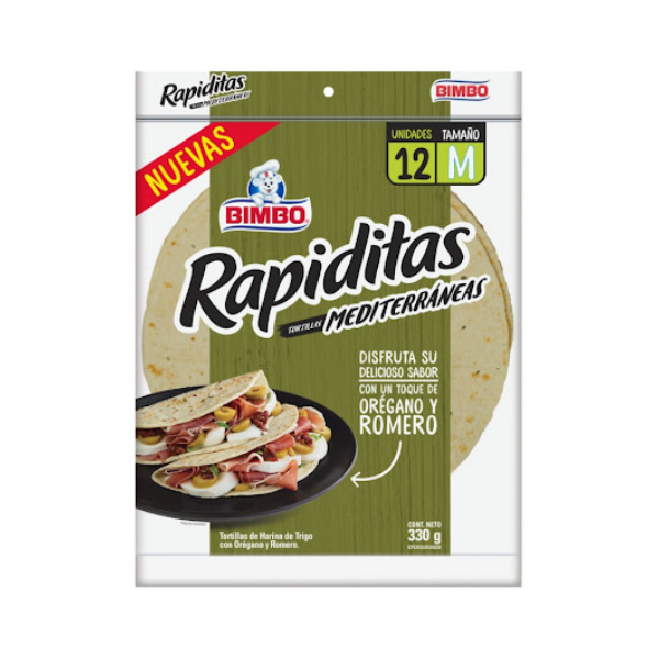 Tortillas Mediterráneas Bimbo Rapiditas, presentación de 330 gramos. Deliciosas y versátiles tortillas con un toque mediterráneo, perfectas para preparar wraps, tacos y más. Elaboradas con ingredientes de alta calidad para un sabor inigualable.