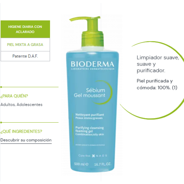 Sébium Gel moussant limpia y purifica suavemente la piel sin resecarla: contiene sulfato de zinc y sulfato de cobre, limpia la epidermis, reduce el número de manchas y limita la secreción de sebo. Su fórmula ultra suave y sin jabón respeta el equilibrio de la piel: se mantiene el pH fisiológico. El complejo natural patentado elevó el umbral de tolerancia de la piel.