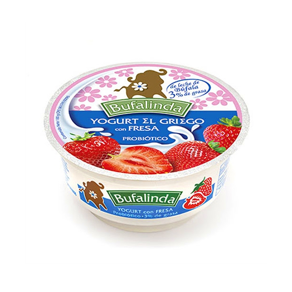 Yogurt con sabor a fruta de fresa de la marca Bufalinda, una opción sabrosa y saludable para disfrutar en cualquier momento del día.