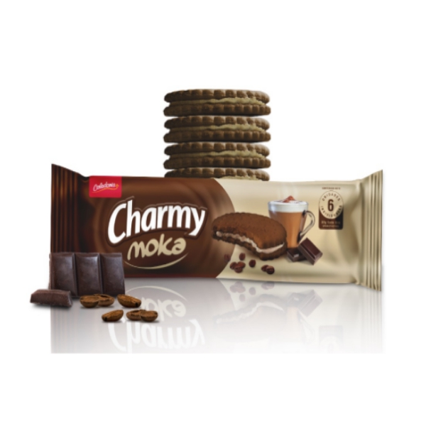 -La presentación de 192g viene en 6 paquetes individuales con 2 galletas cada una. Además, su empaque individual las hace ideal para las loncheras, las idas al parque o su reventa al detal, conservando la frescura, higiene y seguridad esenciales. Cabe resaltar que Charmy Moka es un producto apto para todas las edades, porque, aunque su crema de relleno es sabor a café, no posee cafeína.