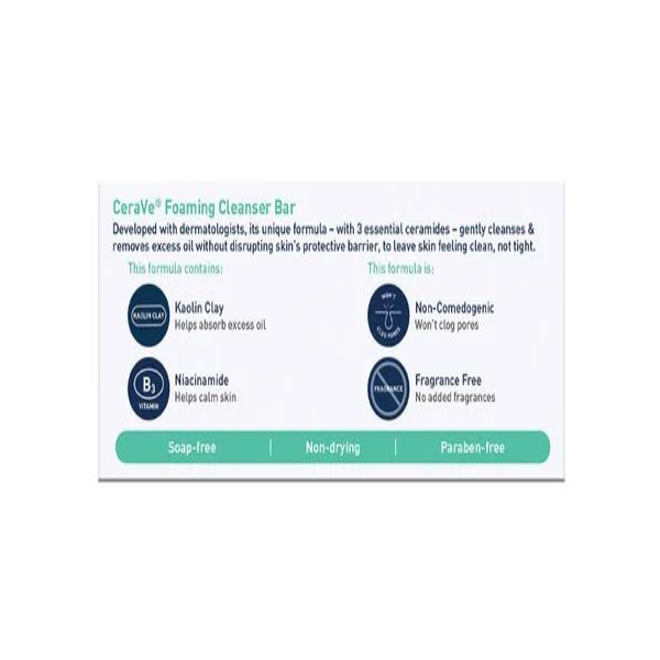 Desarrollada con dermatólogos, la barra limpiadora espumosa CeraVe es un limpiador eficaz para pieles normales a grasas en el rostro y el cuerpo que elimina por completo la suciedad y el exceso de grasa. Con arcilla de caolín, niacinamida , ácido hialurónico y tres ceramidas esenciales , esta suave barra limpiadora diaria absorbe el exceso de grasa, proporciona a la piel la hidratación esencial que no obstruye los poros y ayuda a mantener la barrera protectora de la piel. Sin jabón, sin fragancia, sin parabenos y no reseca, ofrece los beneficios de un limpiador en espuma no comedogénico para pieles grasas en una barra fácil de usar, y deja la piel fresca y limpia, no tirante ni seca.