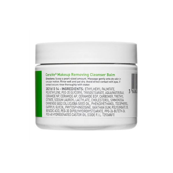 CeraVe Makeup Removing Cleanser Balm presenta una textura aterciopelada de bálsamo derretido que actúa para disolver eficazmente el maquillaje y la base de larga duración, sin dejar residuos grasos en la piel. Esta fórmula de bálsamo limpiador se puede usar dos veces al día para ayudar a hidratar la piel y dejarla suave y reconfortada, al mismo tiempo que ayuda a mantener la barrera protectora de la piel. Desarrollado con dermatólogos y formulado con tres ceramidas esenciales y aceite de jojoba de origen vegetal, este bálsamo limpiador de maquillaje es adecuado para todo tipo de piel, incluida la piel seca , grasa o sensible . Está formulado sin alcohol, jabón, fragancias ni parabenos.