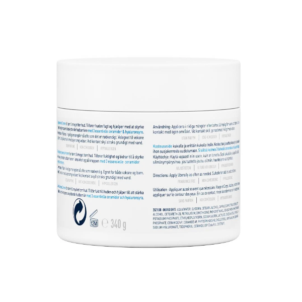 AQUA / AGUA / EAU, GLICERINA, ALCOHOL CETEARÍLICO, TRIGLICÉRIDO CAPRÍLICO/CÁPRICO, ALCOHOL CETÍLICO, CETEARETH-20, PETROLATO, FOSFATO DE POTASIO, CERAMIDA NP, CERAMIDA AP, CERAMIDA EOP, CARBÓMERO, DIMETICONA, METOSULFATO DE BEHENTRIMONIO, LAUROIL LACTILATO DE SODIO, HIALURONATO DE SODIO, COLESTEROL, FENOXIETANOL, EDTA DISÓDICO, FOSFATO DIPOTÁSICO, TOCOFEROL, FITOESFINGOSINA, GOMA XANTANA, ETILHEXILGLICERINA.