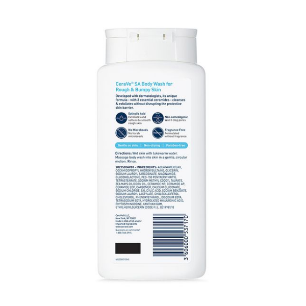 CeraVe SA Body Wash para pieles ásperas y con bultos proporciona una limpieza suave y no irritante además de exfoliación para mejorar la textura de la piel sin microperlas agresivas que puedan rayarla. Además, nuestro gel de baño con ácido salicílico contiene niacinamida para calmar la piel, ácido hialurónico para retener la humedad natural de la piel y tres ceramidas esenciales para mantener la barrera protectora de la piel.