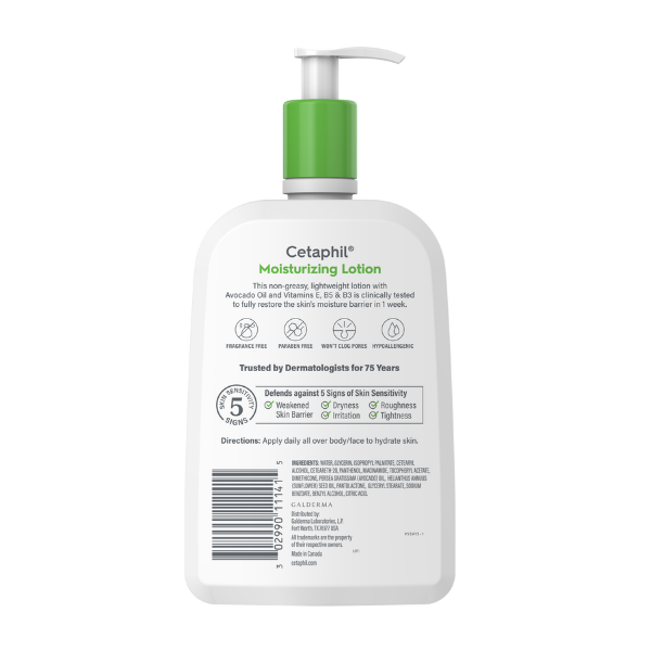 Esta loción ligera y de rápida absorción está formulada con una combinación de ingredientes clave avalada por dermatólogos: glicerina hidratante, pantenol (vitamina B5) para hidratar, calmar y preservar la barrera cutánea, y niacinamida (vitamina B3) para ayudar a suavizar la textura de la piel y retener la barrera de humedad de la piel. Esta loción de uso diario alivia instantáneamente y proporciona una hidratación duradera de 48 horas para dejar la piel suave y tersa. Esta loción hidratante también está clínicamente probada para restaurar por completo la barrera de humedad de la piel en una semana. Esta loción protege contra 5 signos de sensibilidad cutánea y está clínicamente probada para ser suave incluso con la piel más sensible.