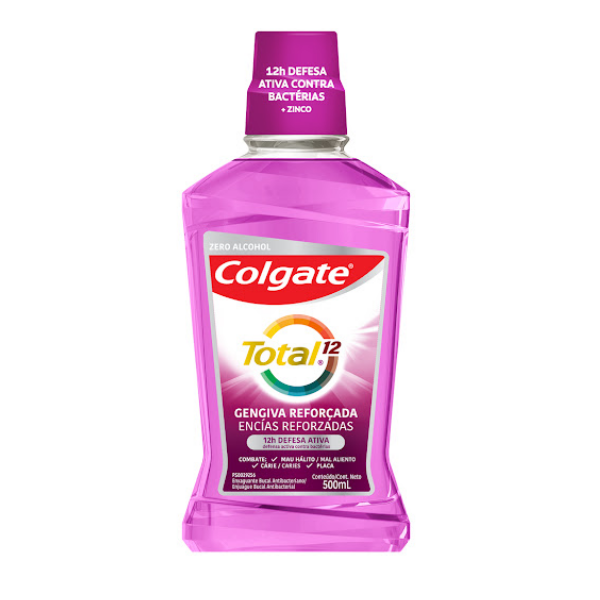 Colgate Total 12 Enjuague Bucal Encías Reforzadas en presentación de 500 ml, proporciona protección completa para las encías, combate las bacterias y ofrece frescura duradera.
