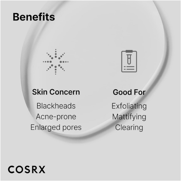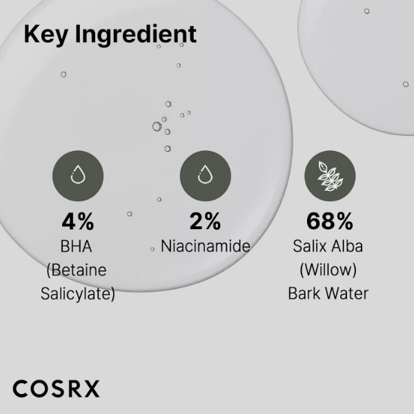 El tónico / esencia BHA Blackhead Power Liquid de COSRX penetra efectivamente en la piel para limpiar a profundidad los poros congestionados. Además ayuda a reconstruir la barrera protectora de la piel.Este poderoso líquido, formulado con Betaine Salicylate, controla el exceso de producción de sebo y ayuda a remover los puntos negros y la piel muerta mientras hidrata la piel. Aplica después de limpiar y tonificar y antes de sueros y cremas. Dispensa en un disco de algodón y aplica en el rostro evitando el área de los ojos y los labios. Coloca de 2 a 3 veces a la semana y ve aumentando hasta llegar a la frecuencia deseada e ideal para tu piel.