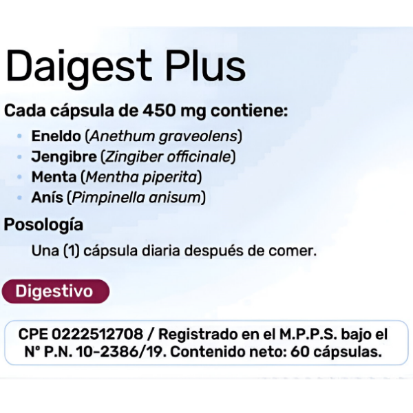 Daigest Plus es un suplemento digestivo natural que facilita la digestión y alivia síntomas de indigestión como hinchazón y gases. Cada cápsula de 450 mg contiene una mezcla de enzimas digestivas y extractos herbales que mejoran la absorción de nutrientes y la digestión en general.