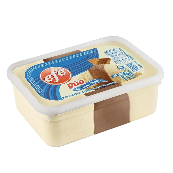 El helado duo de Efe en presentación de 2 litros combina los sabores clásicos de mantecado y chocolate en una deliciosa y cremosa mezcla. Con una textura suave y un sabor irresistible, es perfecto para disfrutar en cualquier ocasión. Ideal para compartir en familia o con amigos.