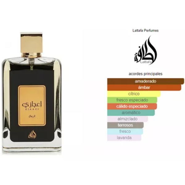 Ejaazi de Lattafa Perfumes es una fragancia de la familia olfativa Oriental para Hombres y Mujeres. Ejaazi se lanzó en 2018. Las Notas de Salida son cítricos, lavanda, naranja, cardamomo y mirto; las Notas de Corazón son pimienta, pachulí, lirio de los valles (muguete) y Hoja de la canela; las Notas de Fondo son ambroxan, notas amaderadas, ámbar, cedro, musgo de roble y vetiver.