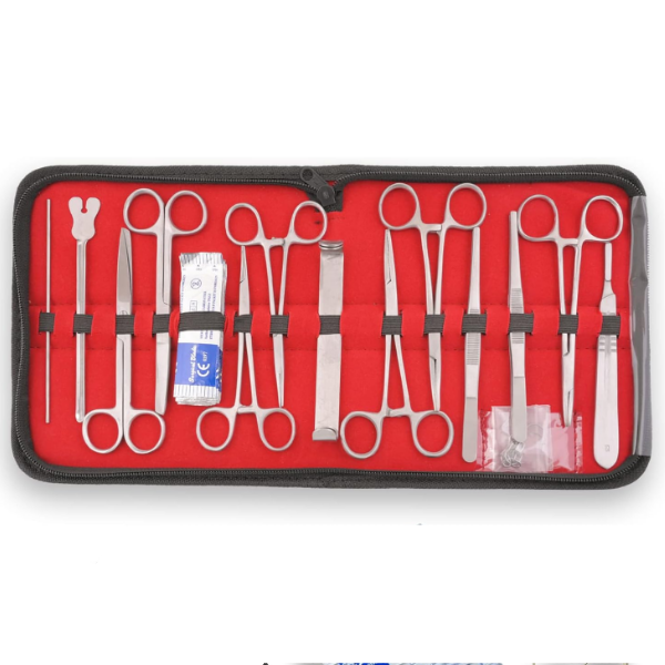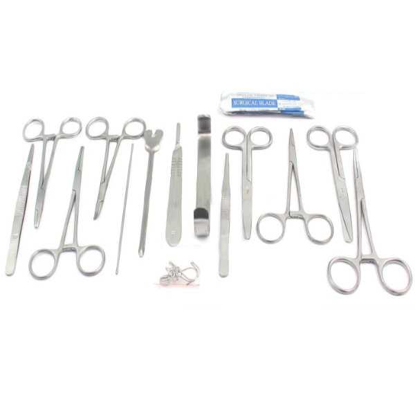 Conjunto completo de 13 piezas quirúrgicas de alta calidad, diseñado para procedimientos médicos menores. Incluye pinzas, tijeras y otros instrumentos esenciales fabricados en acero inoxidable, garantizando durabilidad y esterilidad.