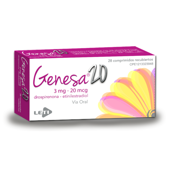 Genesa 20 de Letifem, combinación de drospirenona y etinilestradiol en dosis de 3 mg/20 mcg, en envase de 28 comprimidos. Anticonceptivo oral de baja dosis que regula el ciclo menstrual y previene el embarazo. Proporciona un control hormonal eficaz con pocos efectos secundarios.