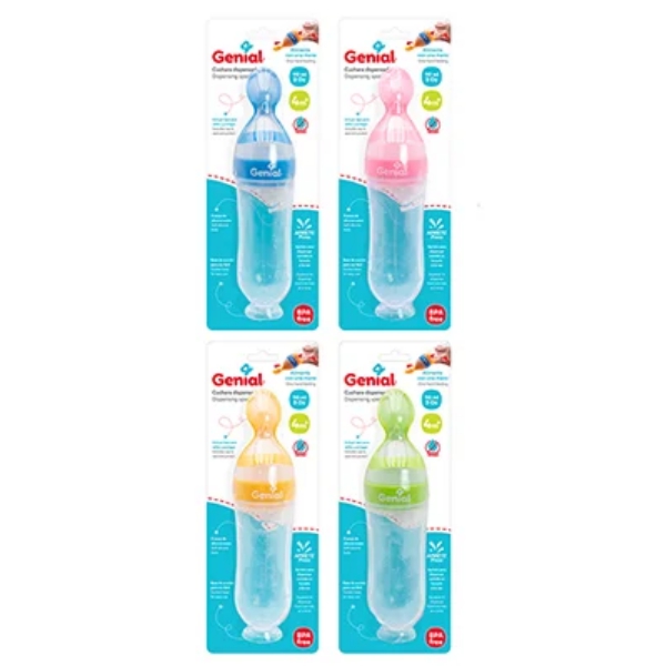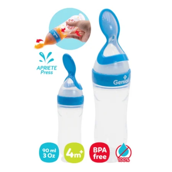 Cuchara dispensadora con capacidad de 90ml, ideal para administrar alimentos líquidos o semisólidos a bebés de manera controlada.