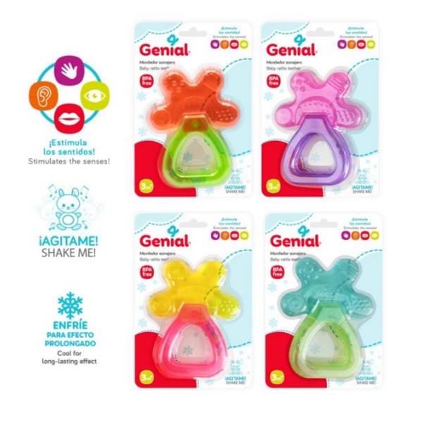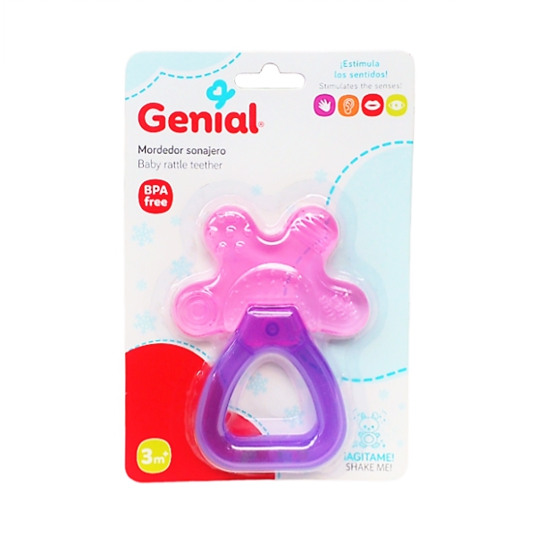 El mordedor sonajero Genial Gn-Bt002 está diseñado para bebés a partir de 3 meses, ofreciendo un alivio efectivo durante la dentición. Combina un mordedor con un sonajero, hecho de materiales seguros y resistentes. Ayuda a masajear las encías y reduce el malestar de la dentición, mientras que el sonajero estimula habilidades auditivas y motoras. Ideal para apoyar el desarrollo del bebé y aliviar el dolor dental.