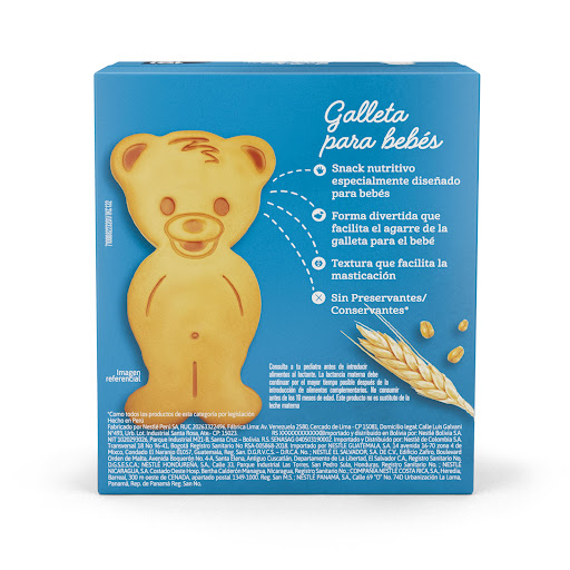 - Ingredientes: Harina de trigo fortificada (81,2%), [Fumarato ferroso, Niacina (Vitamina B3), Mononitrato de tiamina (Vitamina B1), Riboflavina (Vitamina B2), Acido fólico (Vitamina B9)], Aceite de girasol, Azúcar, Leche descremada en polvo, Minerales (carbonato de Calcio y Fumarato ferroso), Gasificante (Carbonato ácido de amonio SIN503ii ), reguladores de la acidez (Carbonato ácido de sodio SIN500ii y Fosfato diácido de calcio SIN341i), emuslificante (Lecitina de soya SIN322i) y Mononitrato de tiamina (Vitamina B1)