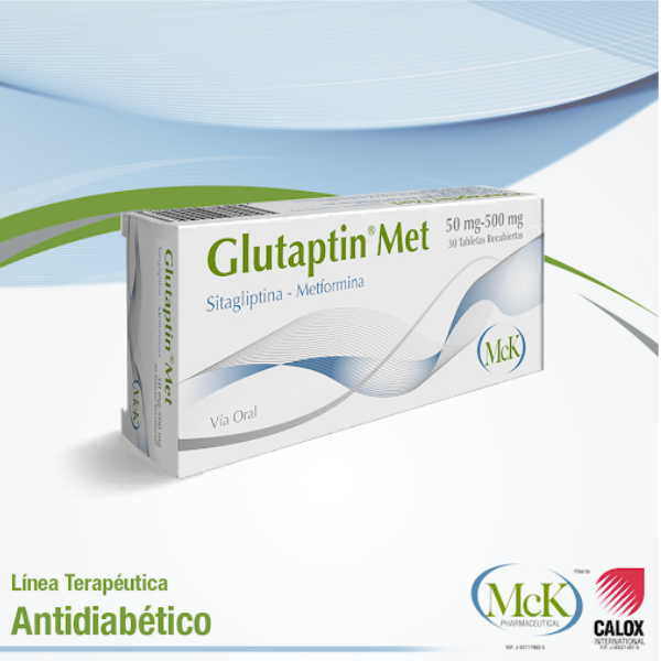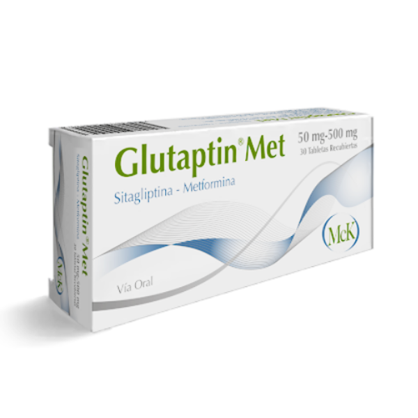 Medicamento Glutaptin Met compuesto por Sitagliptina y Metformina, con dosis de 50 mg/500 mg, presentación de 30 tabletas. Utilizado en el tratamiento de la diabetes tipo 2 para mejorar el control de la glucosa en sangre.