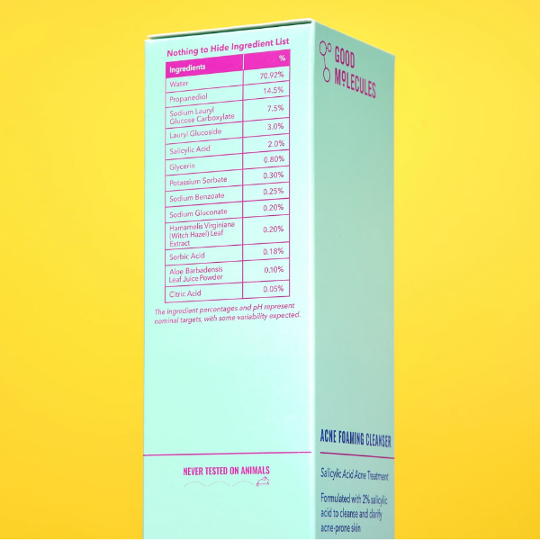 Trate el acné y los brotes con este limpiador exfoliante de Good Molecules. Acne Foaming Cleanser es un limpiador esponjoso en espuma con 2% de ácido salicílico, un ingrediente antiinflamatorio y antimicrobiano que exfolia la superficie de la piel y lo profundo de los poros. ¿El resultado? Piel limpia y cómoda ahora y un cutis suave, radiante y de tono uniforme con el tiempo.