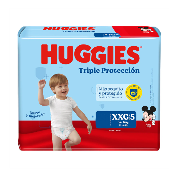 Pañales Huggies Triple Protección, diseñados para brindar una máxima absorción y comodidad en cada uso. Con tecnología que proporciona hasta 12 horas de protección contra fugas, estos pañales son ideales para bebés en etapa de crecimiento activo. La talla XXG está diseñada para adaptarse cómodamente a bebés de mayor peso y tamaño, asegurando libertad de movimiento sin sacrificar la comodidad. Con un sistema de ajuste anatómico y materiales suaves que cuidan la piel, estos pañales ofrecen protección confiable día y noche. Presentación de 20 unidades