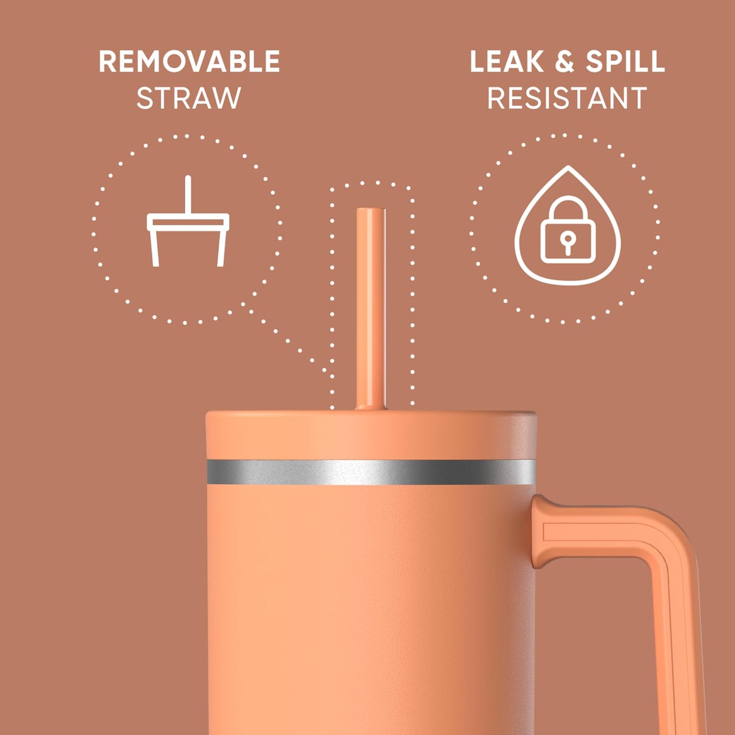 Este vaso térmico Hydrapeak con tapa con pajita y asa está fabricado con acero inoxidable 18/8 de alta calidad apto para uso alimentario y libre de BPA, lo que lo hace más resistente, duradero y garantiza que el vaso permanezca libre de olores. Este vaso de viaje fue diseñado para llevarlo a todas partes.