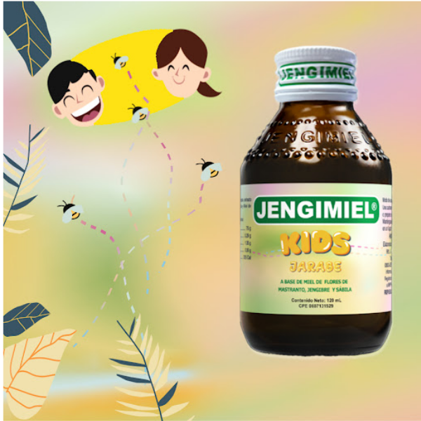 Jarabe infantil que combina jengibre y miel, diseñado para aliviar la tos y el malestar en los niños, proporcionando un efecto calmante y suavizante en la garganta.