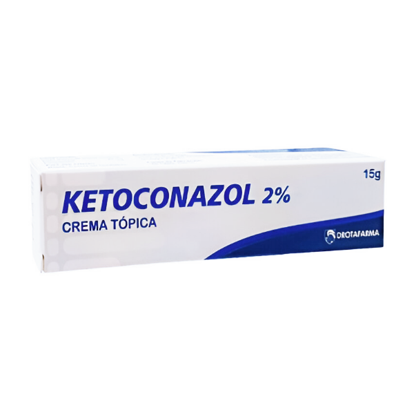 Crema tópica de ketoconazol al 2% en un tubo de 15 gramos de Drotafarma. Este medicamento se utiliza para tratar infecciones fúngicas en la piel, como la tiña, la candidiasis y la pitiriasis versicolor, aliviando los síntomas asociados con estas condiciones.