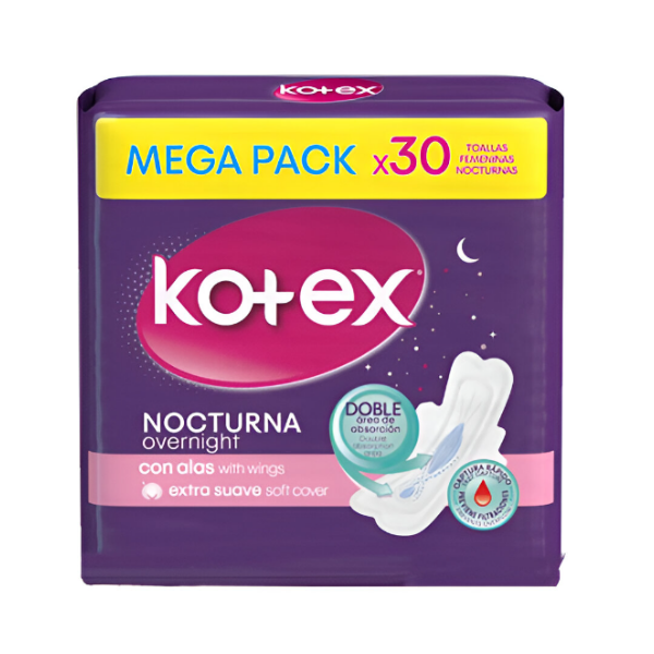 Toallas sanitarias extra suaves de la marca Kotex, diseñadas para uso nocturno, en un paquete de 30 unidades. Ofrecen protección y comodidad durante la noche durante el período menstrual.