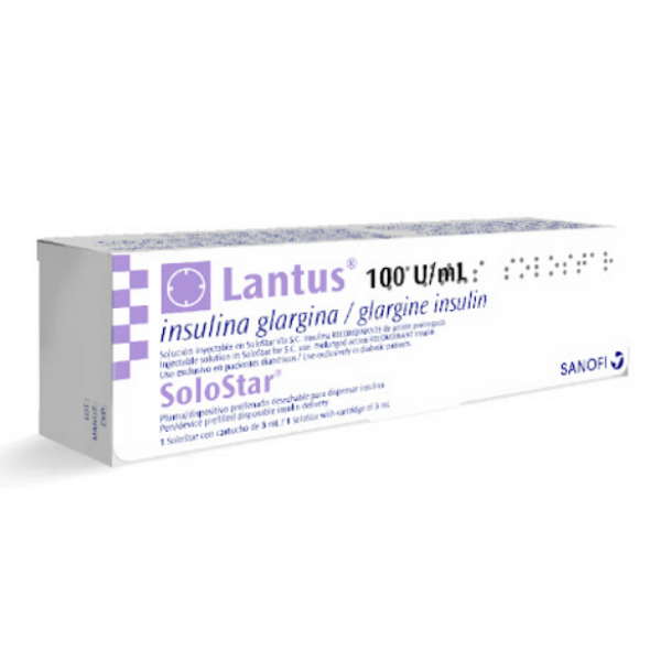 Lápiz de insulina Lantus, con una concentración de 100U/ml y presentación de 3 ml. Jeringa prellenada para facilitar la administración de insulina en pacientes con diabetes, asegurando una dosificación precisa y fácil de usar.