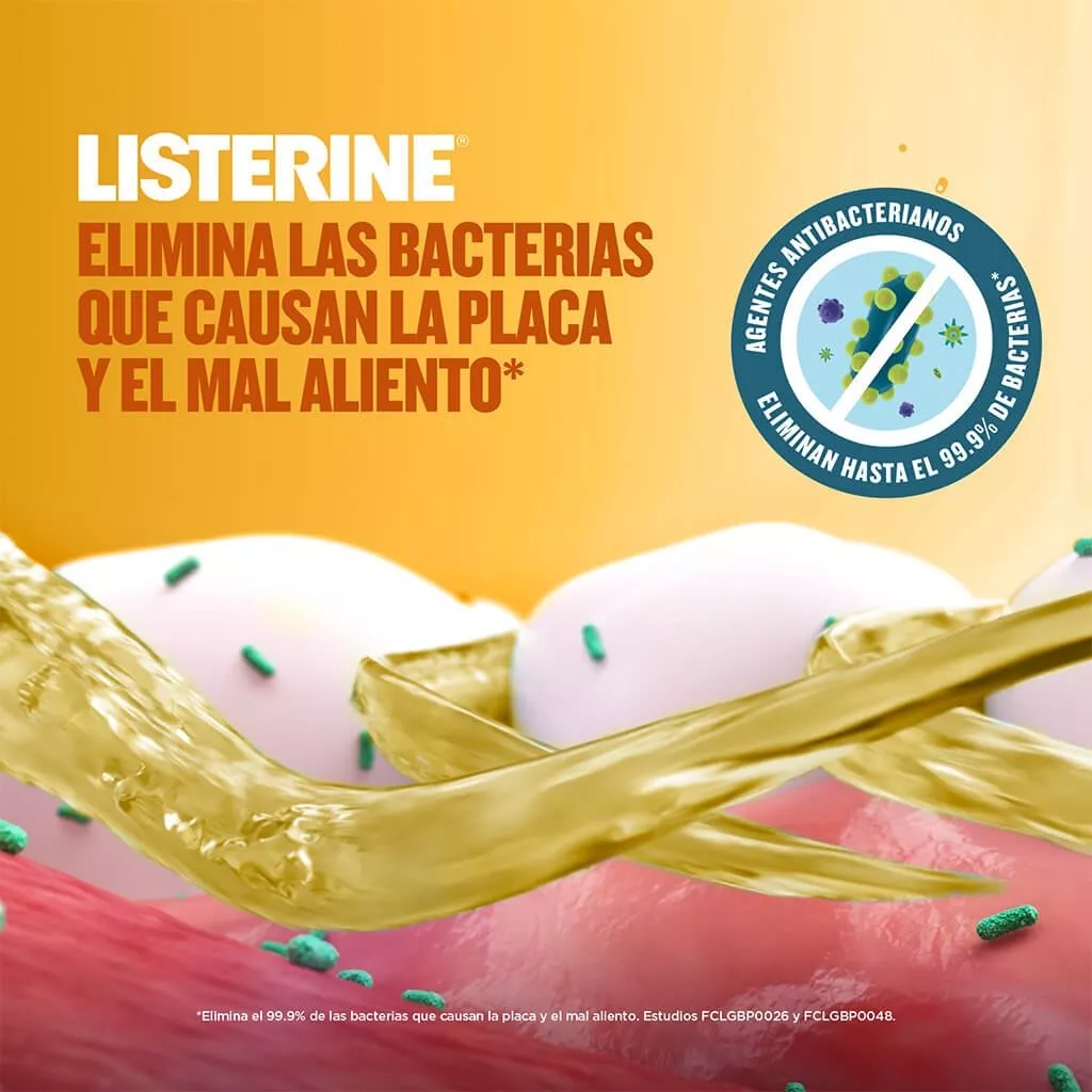 El enjuague bucal Listerine Original ayuda a eliminar los gérmenes que causan mal aliento, placa y gingivitis, dejando una sensación de frescura duradera en la boca. Su fórmula con aceites esenciales penetra entre los dientes y alcanza lugares donde el cepillado no llega, ofreciendo una limpieza completa. Se recomienda utilizarlo dos veces al día después del cepillado dental.