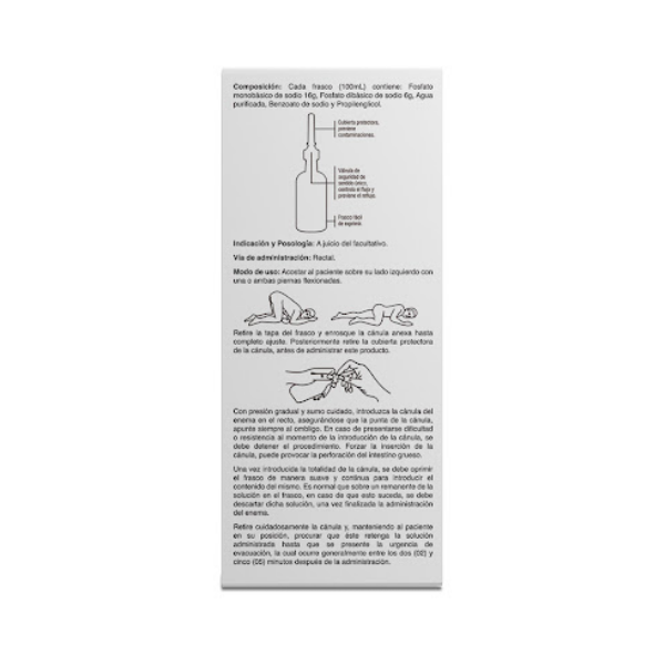 Composición: Cada frasco (100mL) contiene: Fosfato monobásico de sodio 16g, Fosfato dibásico de sodio 6g, Agua purificada, Benzoato de sodio y Propilenglicol.