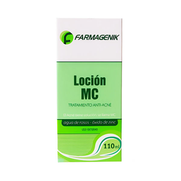 Loción MC Tratamiento Antiacné de Farmagenik, presentación de 110 ml. Formulada con óxido de zinc y agua de rosas, esta loción ayuda a reducir y prevenir el acné, promoviendo una piel más clara y saludable. Ideal para uso diario en pieles propensas a imperfecciones.