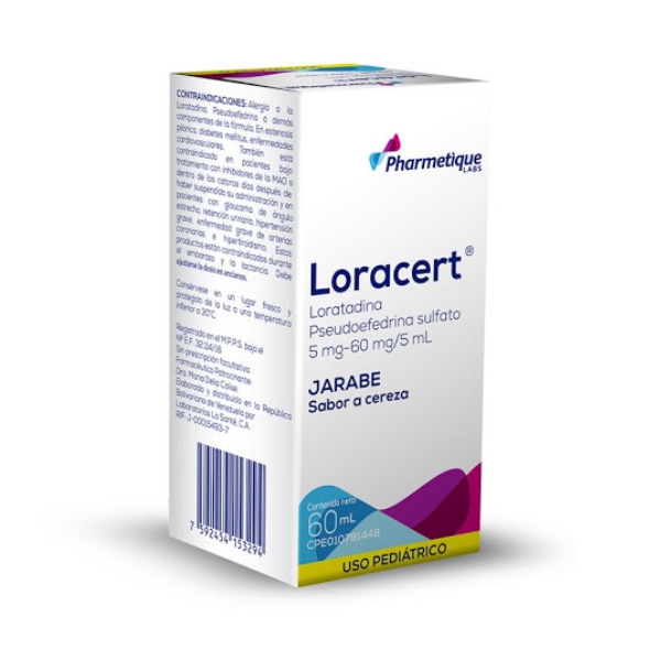 Loracert Loratadina+Pseudoefedrina Jarabe Pediátrico 5mg-60mg/5ml x 60ml – Pharmetique