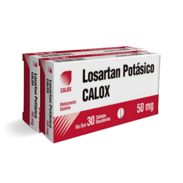 Tabletas de losartán potásico de 50 mg, en un envase de 30+30 unidades de la marca Calox. Este medicamento se utiliza para tratar la presión arterial alta y reducir el riesgo de accidentes cerebrovasculares en personas con enfermedad cardiovascular.