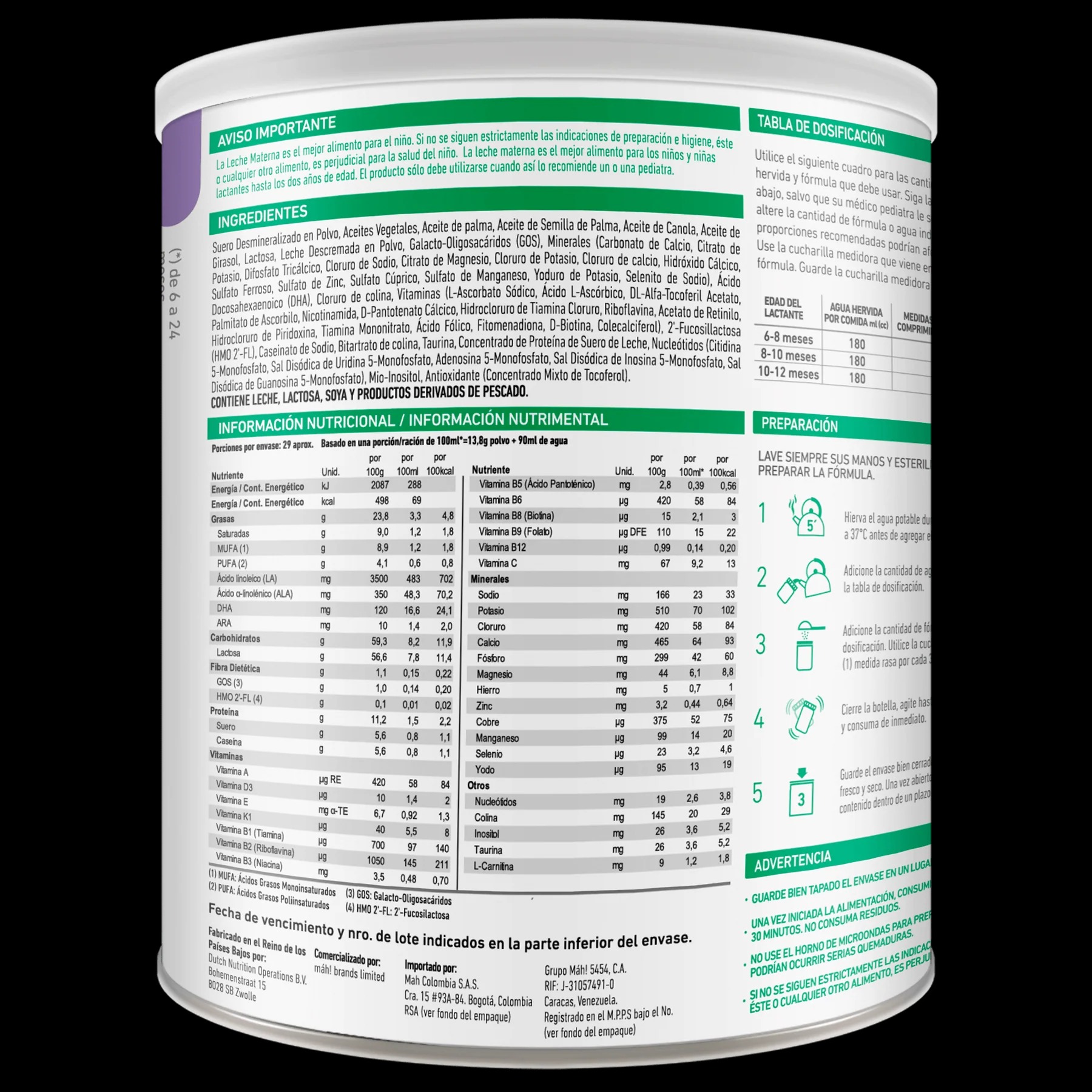 El desarrollo de tu pequeño se apoya en una nutrición adecuada. Nuestra mezcla de prebióticos ha sido estudiada en relación con el desarrollo cognitivo y neurológico.2, 4 El DHA se incluye por su importancia en el desarrollo cerebral y visual.6 Además, la lactosa contribuye al desarrollo general en procesos como la formación de huesos fuertes, músculos y piel saludable.11 Mientras los nucleótidos contribuyen al desarrollo normal y apoyan áreas específicas como la reparación ocular.9