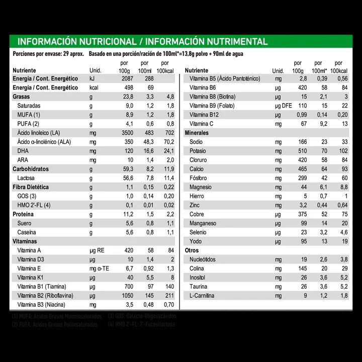 Nuestra formulación contiene una mezcla de prebióticos (HMO 2’FL – GOS) diseñada para apoyar la salud intestinal. Esta combinación tiene el potencial de mejorar la regularidad intestinal y la consistencia de las heces.1, 3 La lactosa presente ayuda al crecimiento de bacterias beneficiosas,10 y los nucleótidos están incluidos por su relación con la función intestinal.7