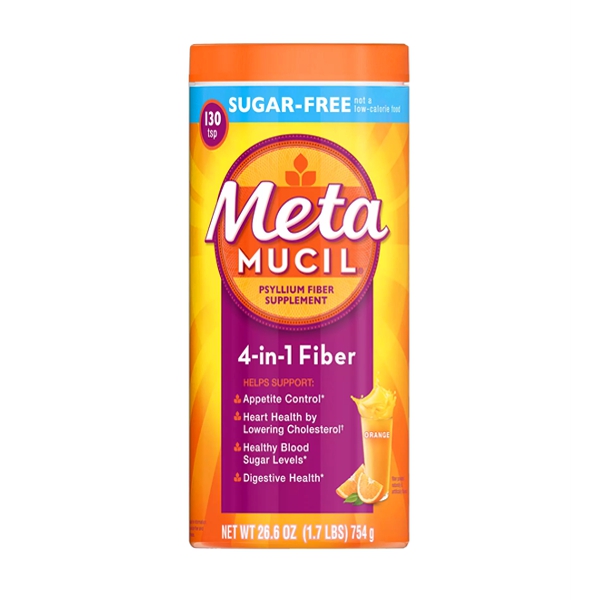 Suplemento de fibra en polvo 4 en 1 Meta Mucil, en sabor a naranja. Esta fórmula contiene psyllium, que ayuda a promover la salud digestiva y regularidad intestinal, reducir el colesterol y controlar los niveles de azúcar en la sangre. Ideal para mejorar la dieta y la salud intestinal.