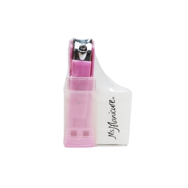 El cortaúñas de Ms. Manicure es una herramienta de manicura diseñada para recortar y dar forma a las uñas, con un estuche rosado para un almacenamiento seguro y conveniente.