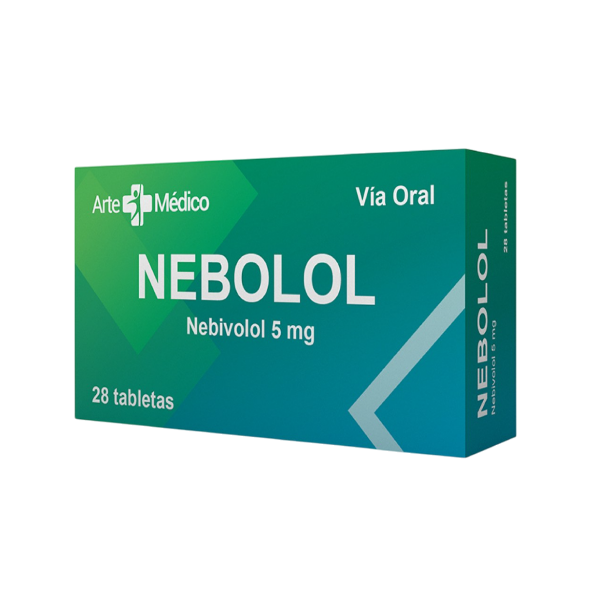 Tabletas de Nebivolol 5 mg, un betabloqueador indicado para el tratamiento de la hipertensión arterial y enfermedades cardiovasculares. Este medicamento ayuda a regular la frecuencia cardíaca y mejorar la función del corazón. Presentación de 28 tabletas, diseñadas para un uso diario y prolongado bajo prescripción médica.